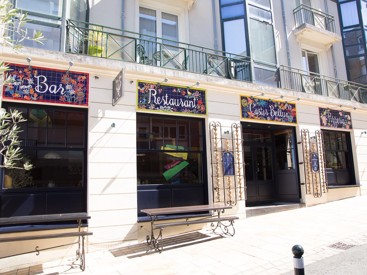 Castor Bellux Dinard, devanture céramique bleu nuit avec panneaux Bar Restaurant Pizzeria